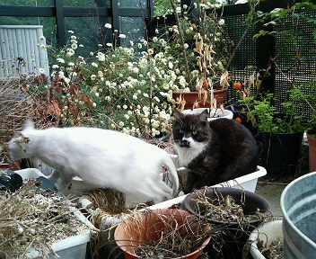 駆け出すしろにゃん、なぜかカメラ目線(?)のくろにゃん、いや~、十分なごみます~