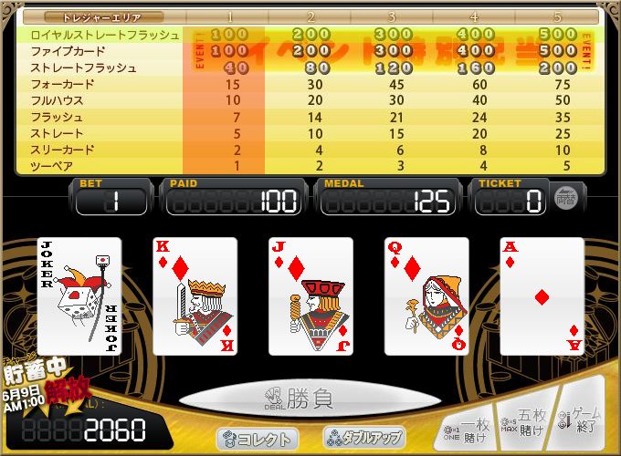 ポーカーでジャックポットを出せば全員大量メダルを保障って嘘書くなよ。 最高たった500枚でどこが大量なんだ。 実際揃ってもこんなものだぞ。 だいたいダブルアップなんて高額役の時に限って外れるんだからできないだろ・・・